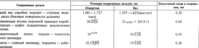 Зеркало цилиндра и наружная поверхность поршней главного и рабочего цилиндров не должны иметь повреждений и коррозии; обнаруженные небольшие задиры или точечная коррозия устраняются мелкозернистым шлифовальным бруском. Проверяют состояние возвратной пружины поршня главного цилиндра и заменяют ее, если она имеет трещины. Заменяют уплотнительные кольца независимо от их состояния. Проверяют защитные колпачки. Если они повреждены, заменяют новыми. Не допускается деформация толкателей. Размеры основных сопрягаемых деталей сцепления и пределы допустимых износов даны в табл.