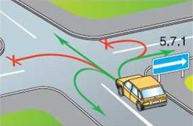5.7.1, 5.7.2 "Выезд на дорогу с односторонним движением". Выезд на дорогу или проезжую часть с односторонним движением. Знак 5.7.1 не запрещает разворот на пересекаемой дороге против направления одностороннего движения. При повороте направо на перекрестке, где установлен знак 5.7.1, водитель должен двигаться как можно ближе к правой части проезжей части. После поворота разрешено использовать всю ширину проезжей части.