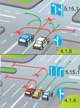 5.15.7 "Направление движения по полосам". Если на знаке 5.15.7 изображен знак, запрещающий движение каким-либо транспортным средствам, то движение этих транспортных средств по соответствующей полосе запрещается. Знаки 5.15.7 с соответствующим числом стрелок могут применяться на дорогах с четырьмя и более полосами.